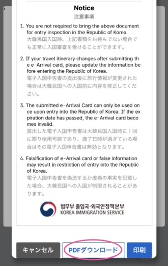 で「電子入国申告書を見る」をタップ後、次の画面が出てきたら、一番下に「PDFダウンロード」というボタンがあるのでタップします。