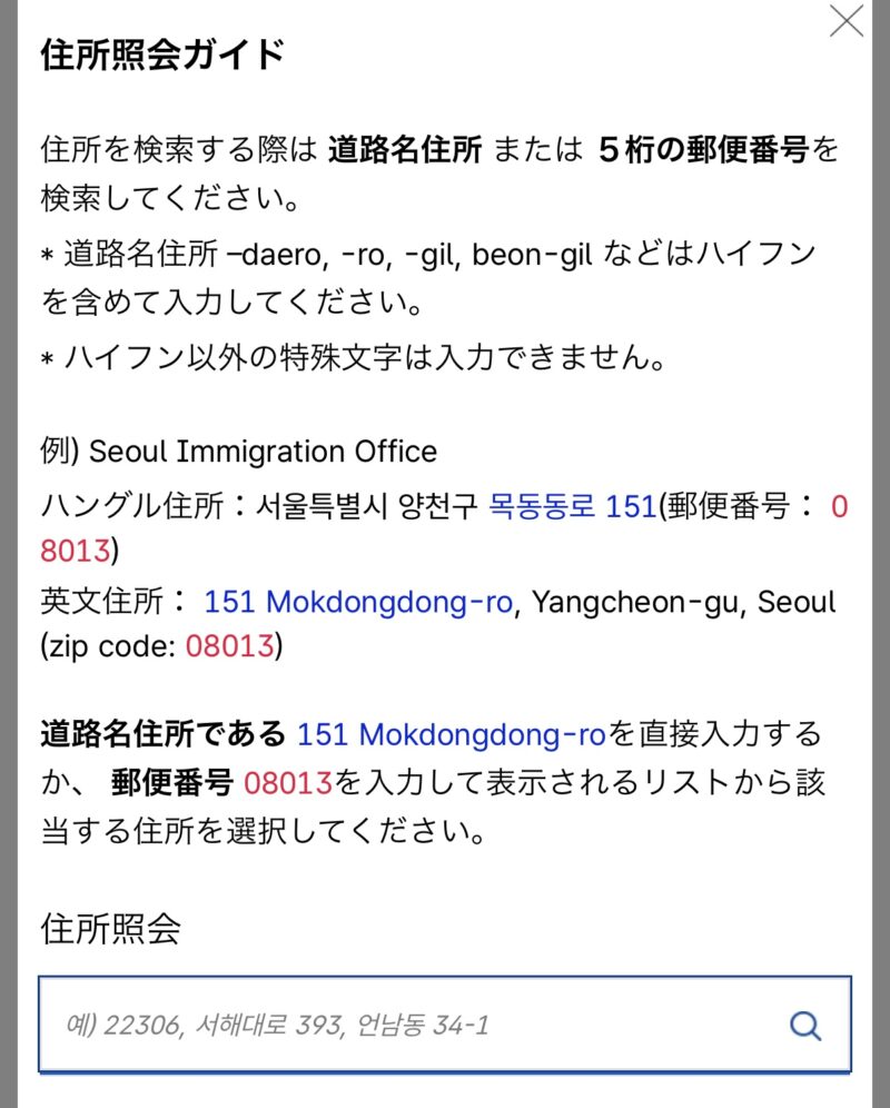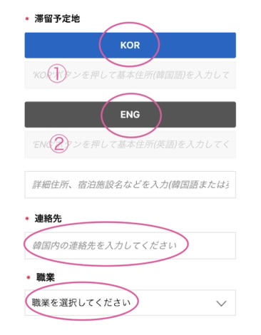 韓国語か英語で滞在先情報を入力します。