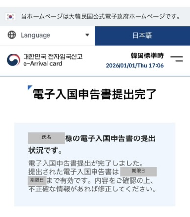 「電子入国申告書提出完了」という文字とともに、名前と期日が書かれた文章が出てきます。