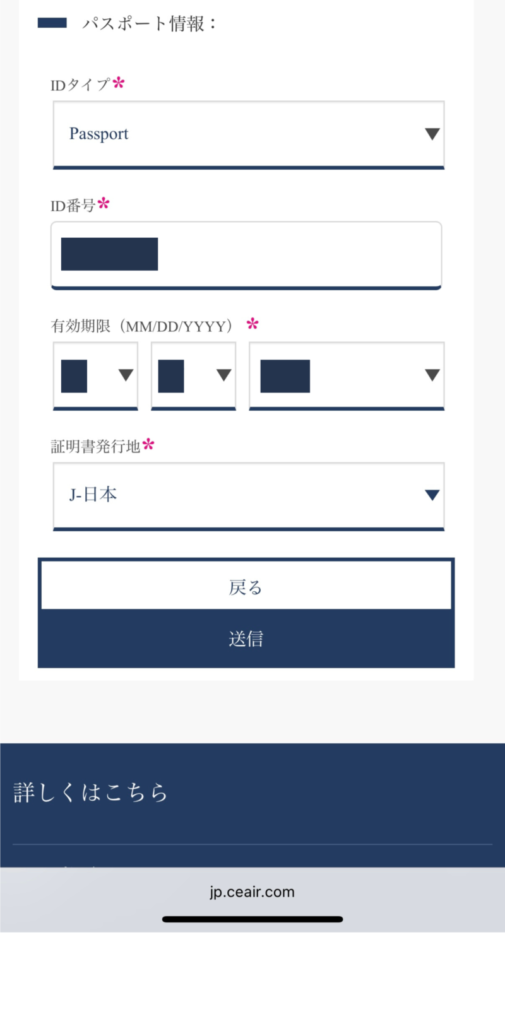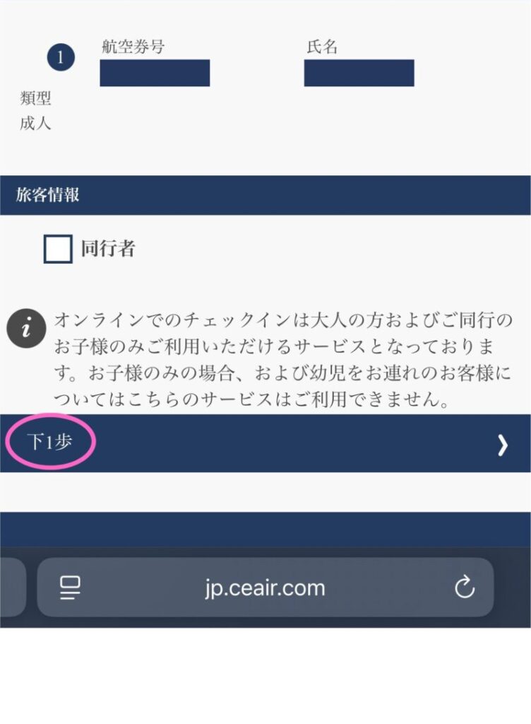 航空番号と氏名が表示されますが、同行者がいる場合にはここで登録が始まるようです。