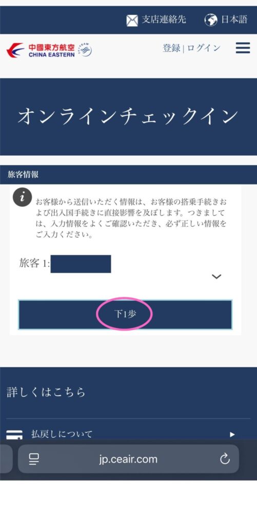 中国東方航空のオンラインチェックインはスマホでやりました。
