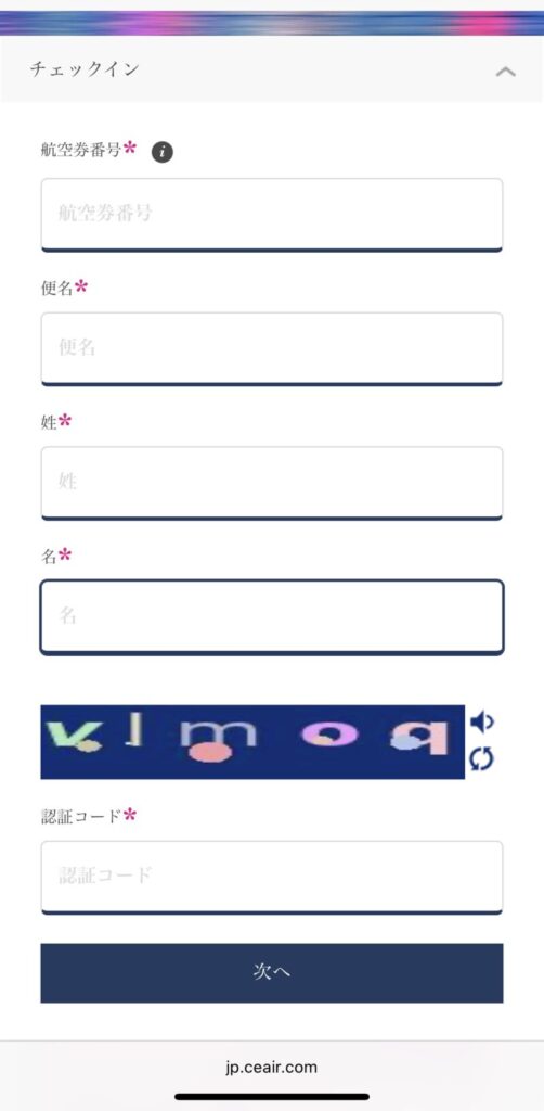 航空券番号と便名(アルファベットと数字の組み合わせ)、姓名を入れます。